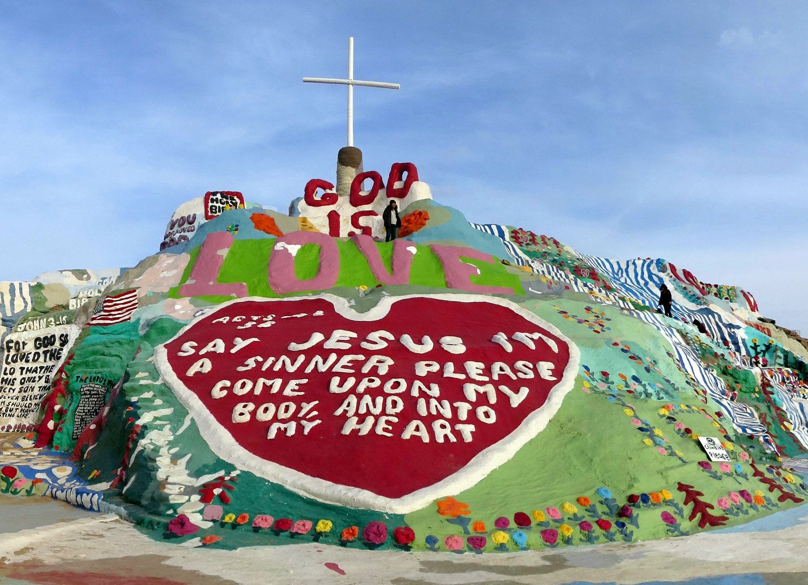 The community there is divided into many camps and art installations, this is why I wanted to visit. I did not see much desert growing up so I love to see it and long stretches of land that you can see for miles. In Canada there are a lot of trees and it is pretty flat in Ontario so it always is fun for me to see the hills and the red/orange atmosphere. I also really like art so I was drawn to the large paintings they have done in the middle of the nowhere, called Salvation Mountain.